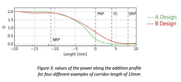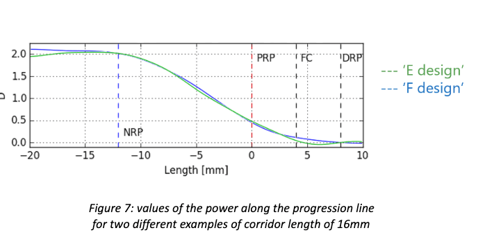 There are, however, some discussions in the literature about what the definition of the corridor length of a progressive lens should be. Some people claim the corridor length originates in the fitting cross. Others, from the centre of the progression. Some designers define the corridor length up to the near reference point, while others up to the fitting height. In this article we will consider the corridor length as the vertical segment from the fitting cross to the near reference point where the addition is measured. In addition, all the examples shown below will be plano addition 2.0 without position of wear, which means that cylinder and sphere in the distance reference point will be 0D and the addition measured in the near reference point will be exactly 2.0D.