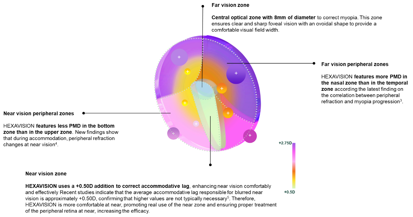 La principal diferencia de HEXAVISION es que gestiona el PMD de forma más eficaz, colocando el desenfoque adecuado en cada zona según los descubrimientos científicos más recientes. Como resultado, se espera que KARE logre un control más óptimo de la miopía en comparación con otras lentes del mercado.