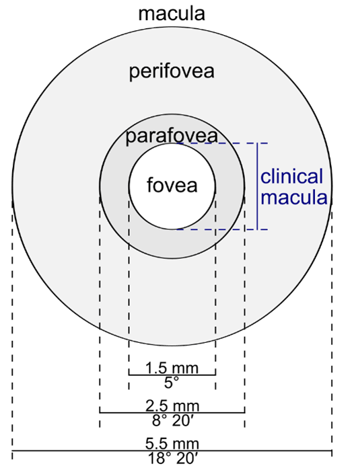 - La mácula es un área de forma ovalada cerca del centro del ojo humano, y tiene un diámetro de aproximadamente 5,5 mm (con un campo de visión de unos 18º).