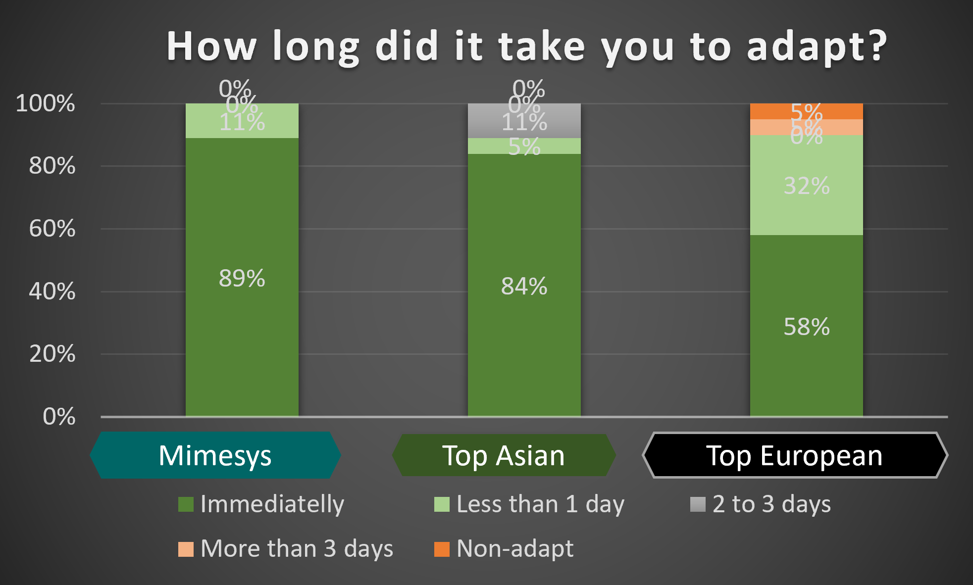 O gráfico a seguir mostra os tempos de adaptação verificados nesse teste de uso, chegando a ser imediato em 89% e de 100% em menos de um dia para os usuários das lentes mimesys® (2) Lens.