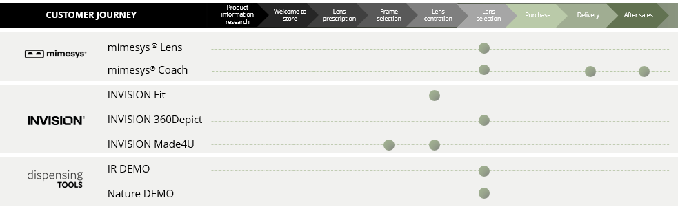 Entre as soluções proporcionadas por Horizons Optical encontra-se Invision FIT, um centralizador 3D de armações que possibilita obter as medidas da posição de uso necessárias para oferecer lentes de alto valor agregado. Também se encontra Invision Made4U, que oferece armações 3D sob medida à morfologia do usuário e customizadas com as cores e gravações que o cliente seleciona. Invision 360Depict, um comparador de espessuras 3D que permite ao óptico escolher a melhor opção e demonstrá-la a seus clientes com efeito uau!