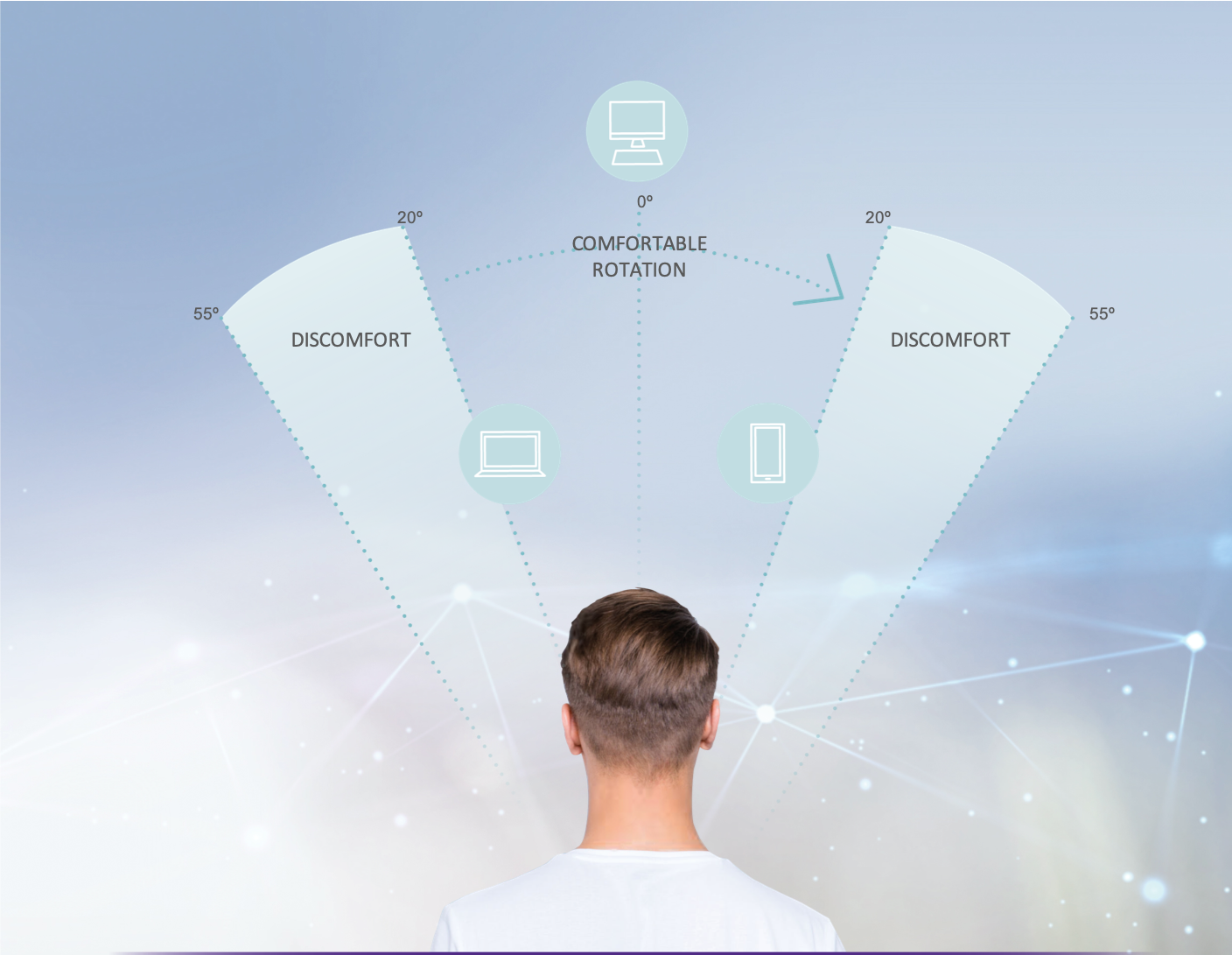 Our visual system has a binocular horizontal visual field of 150º, increasing to 180º when monocular peripheral vision is included. The vertical field is 130º, 60º up and 70º down. In a multi-screen environment, patients require sharp vision across the horizontal field, taking into account the peripheral vision of the lens and avoiding the swim effect when looking from one screen to another.